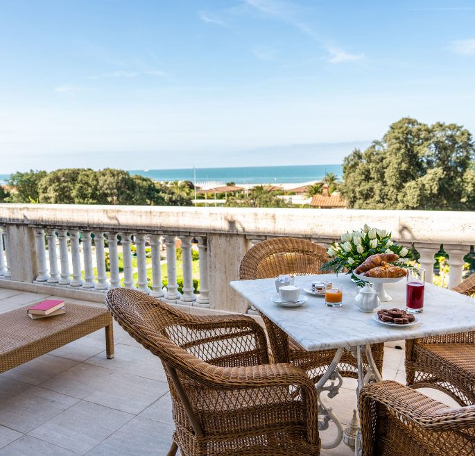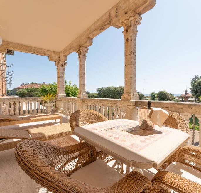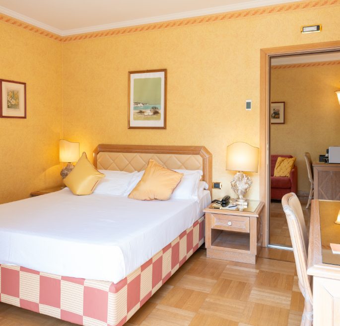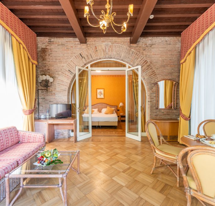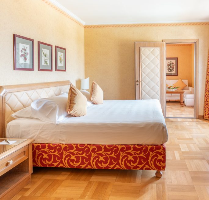 Stile e arredo barocco. Terrazza in marmo travertino con vista parco. La camera si trova nella Villa Storica, non provvista di ascensore.