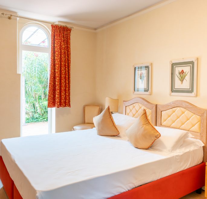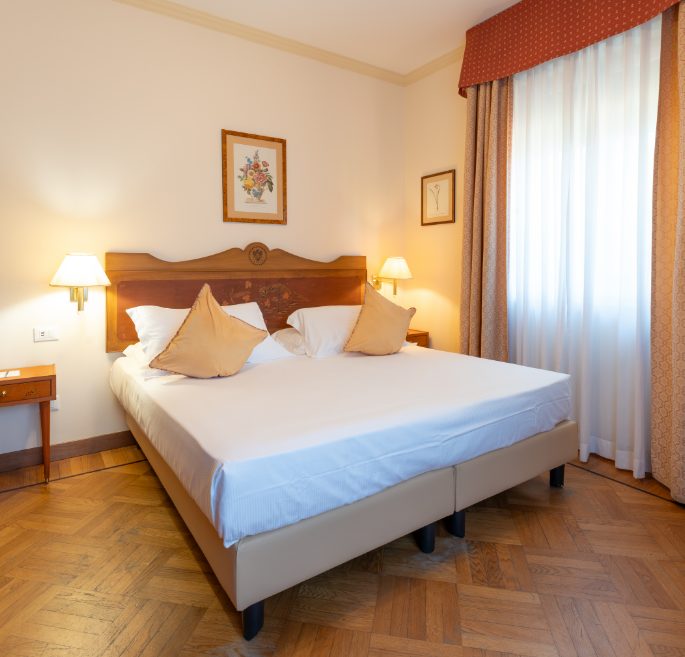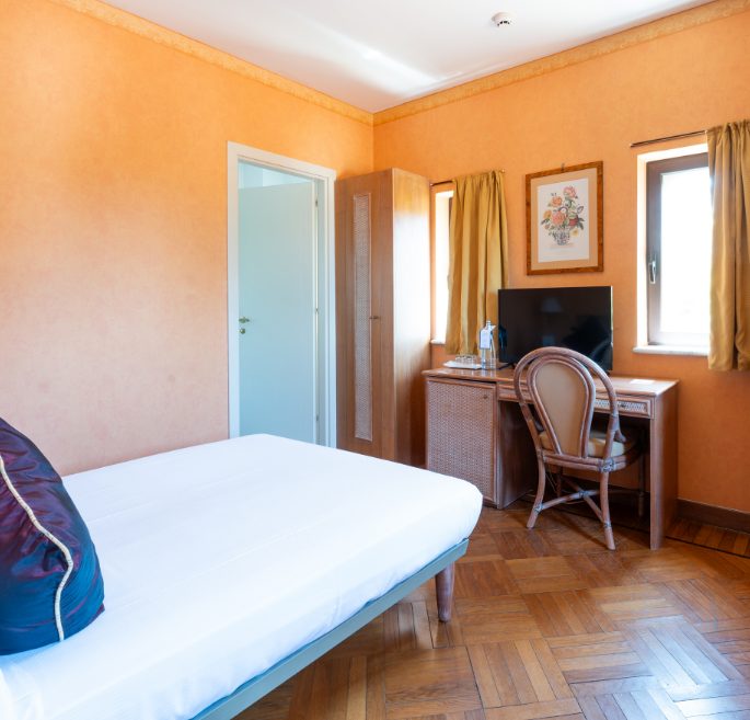 Stile e arredo moderno. La camera si trova nella Villa Duse, provvista di ascensore.