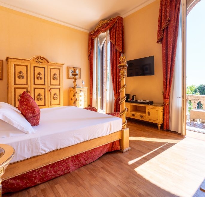 Stile e arredo barocco. Balcone in marmo travertino con vista parco. La camera si trova nella Villa Storica, non provvista di ascensore.