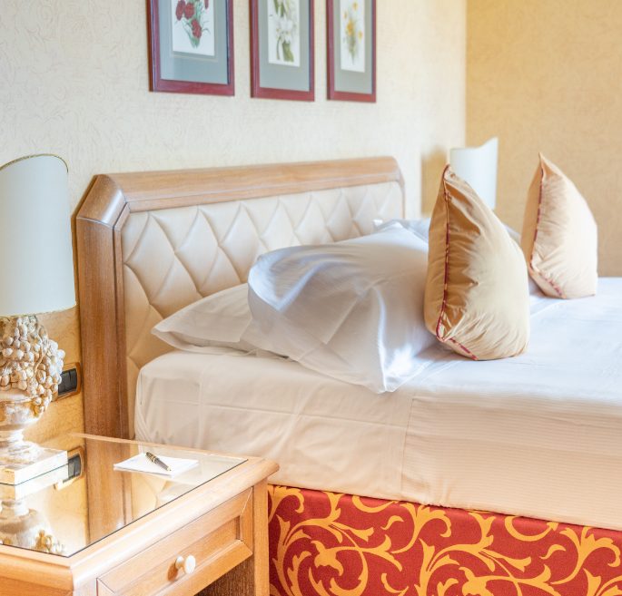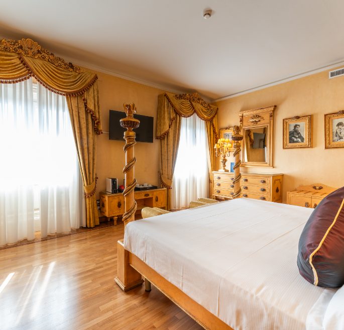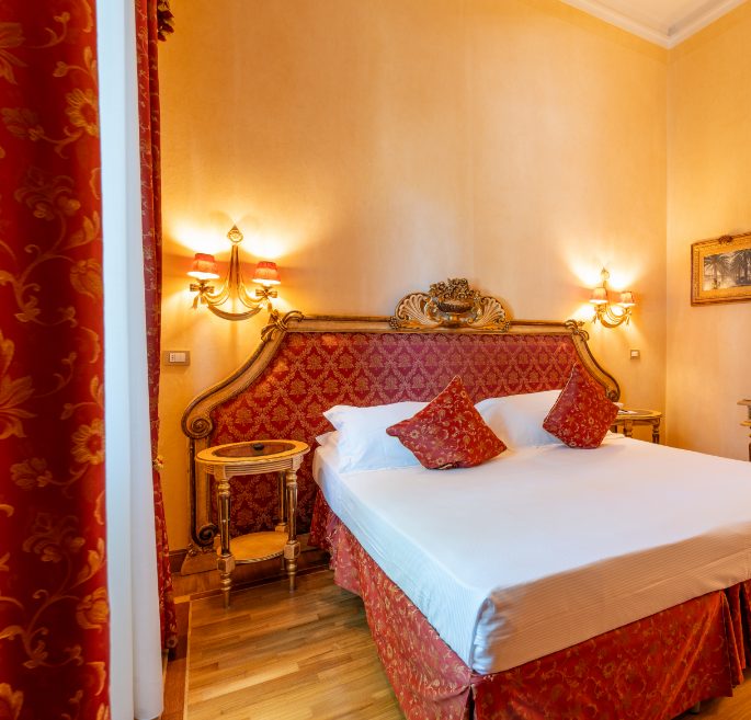 Stile e arredo barocco. La camera si trova nella Villa Storica, non provvista di ascensore.