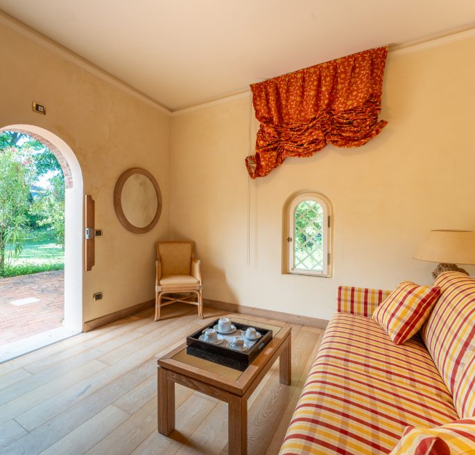 Stile e arredo tra il moderno e il country. La camera si trova nell’edificio Fattoria, non provvisto di ascensore.